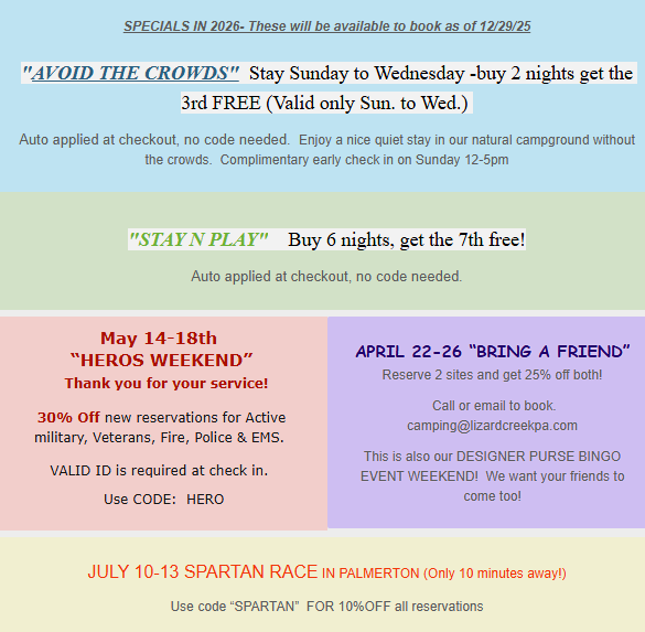SEASONAL SITES FOR 2026 ARE AVAILABLE- EMAIL FOR DETAILS BEFORE FEBRUARY 2026